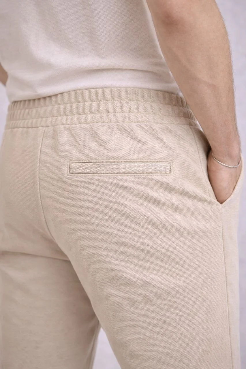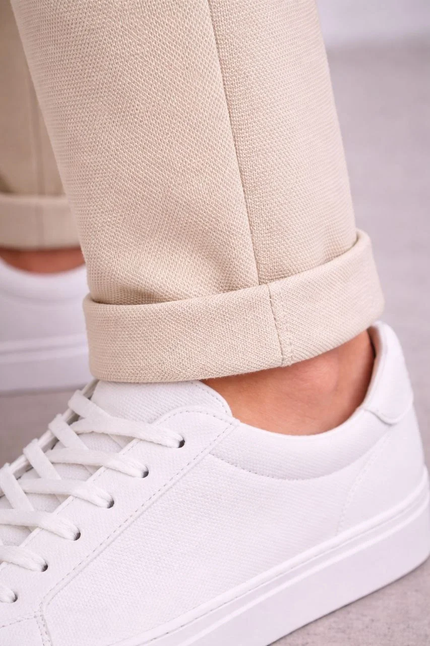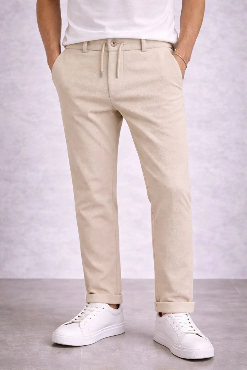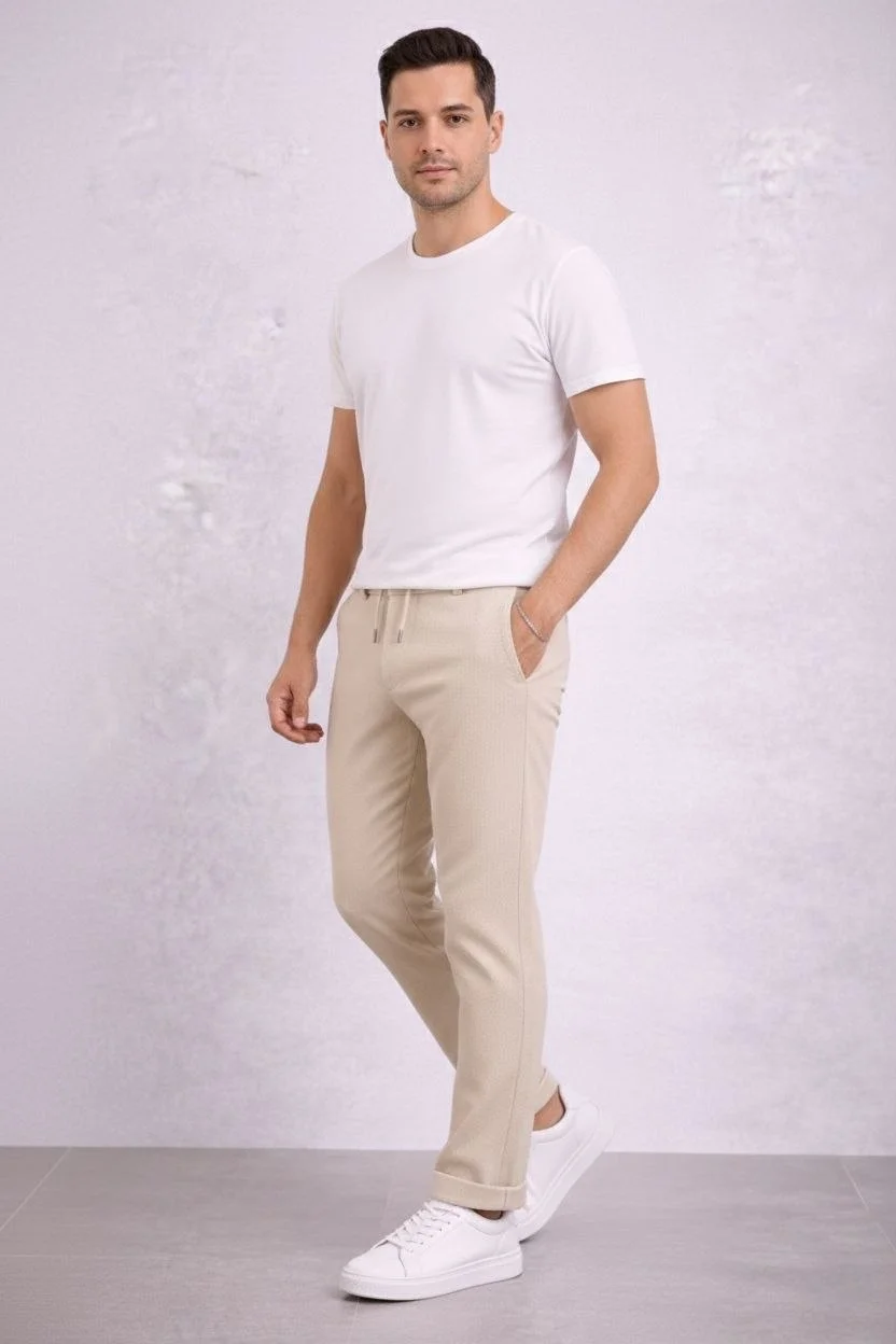 Erkek Diagonel Mikro dokulu Duble Paça Cepli Pantolon Bağcıklı Bel, Modern Kesim - Krem