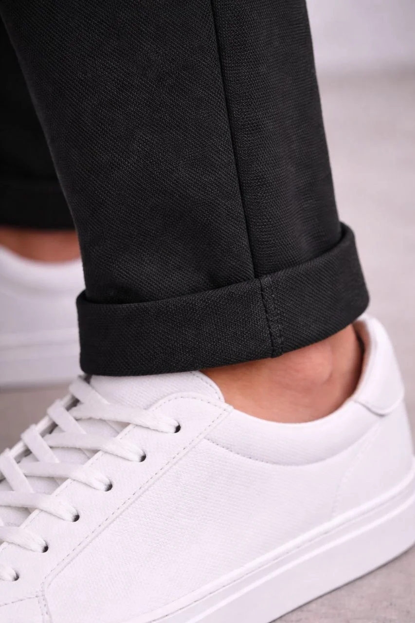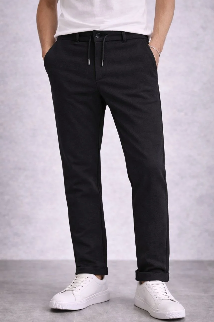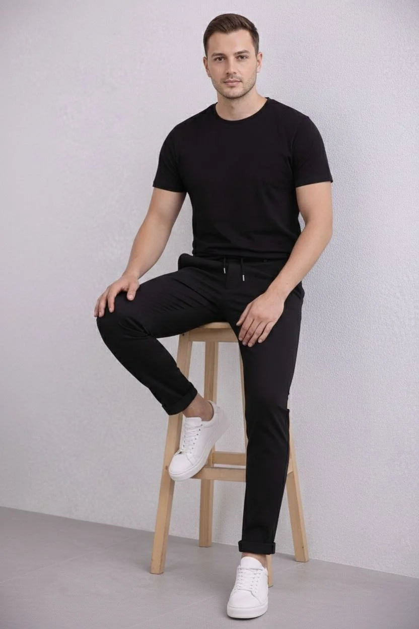 Erkek Diagonel Mikro dokulu Duble Paça Cepli Pantolon Bağcıklı Bel, Modern Kesim - Siyah