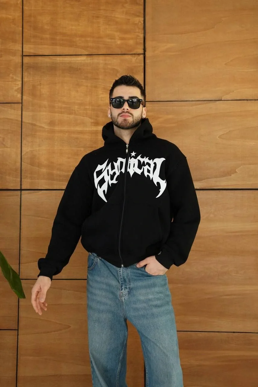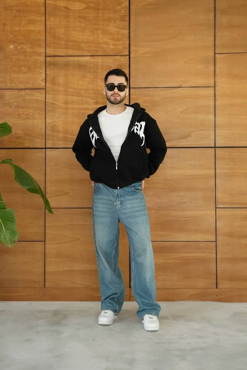 Erkek Kapüşonlu 3 İplik Şardonlu Önü Baskılı Fermuarlı Oversize Sweatshirt - Siyah