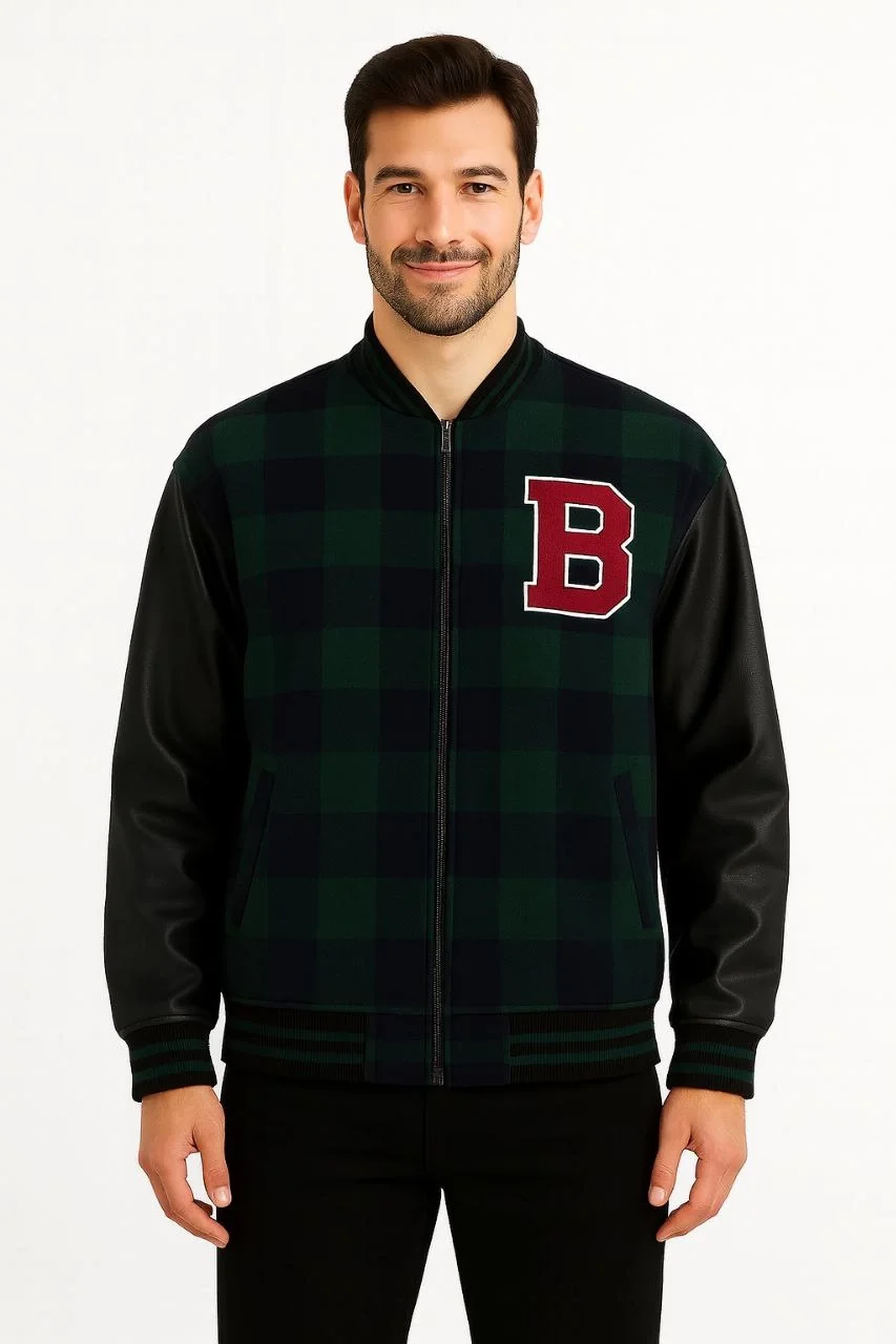 Erkek Kolej Ceket Kareli Oduncu Kolları Suni Deri Fermuarlı İçi Kapitone Astarlı - Haki