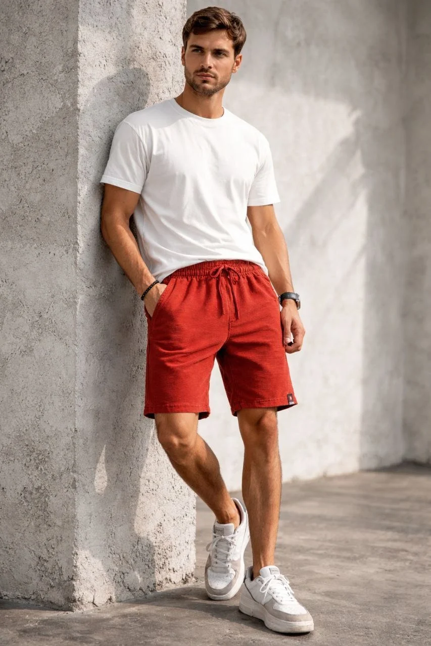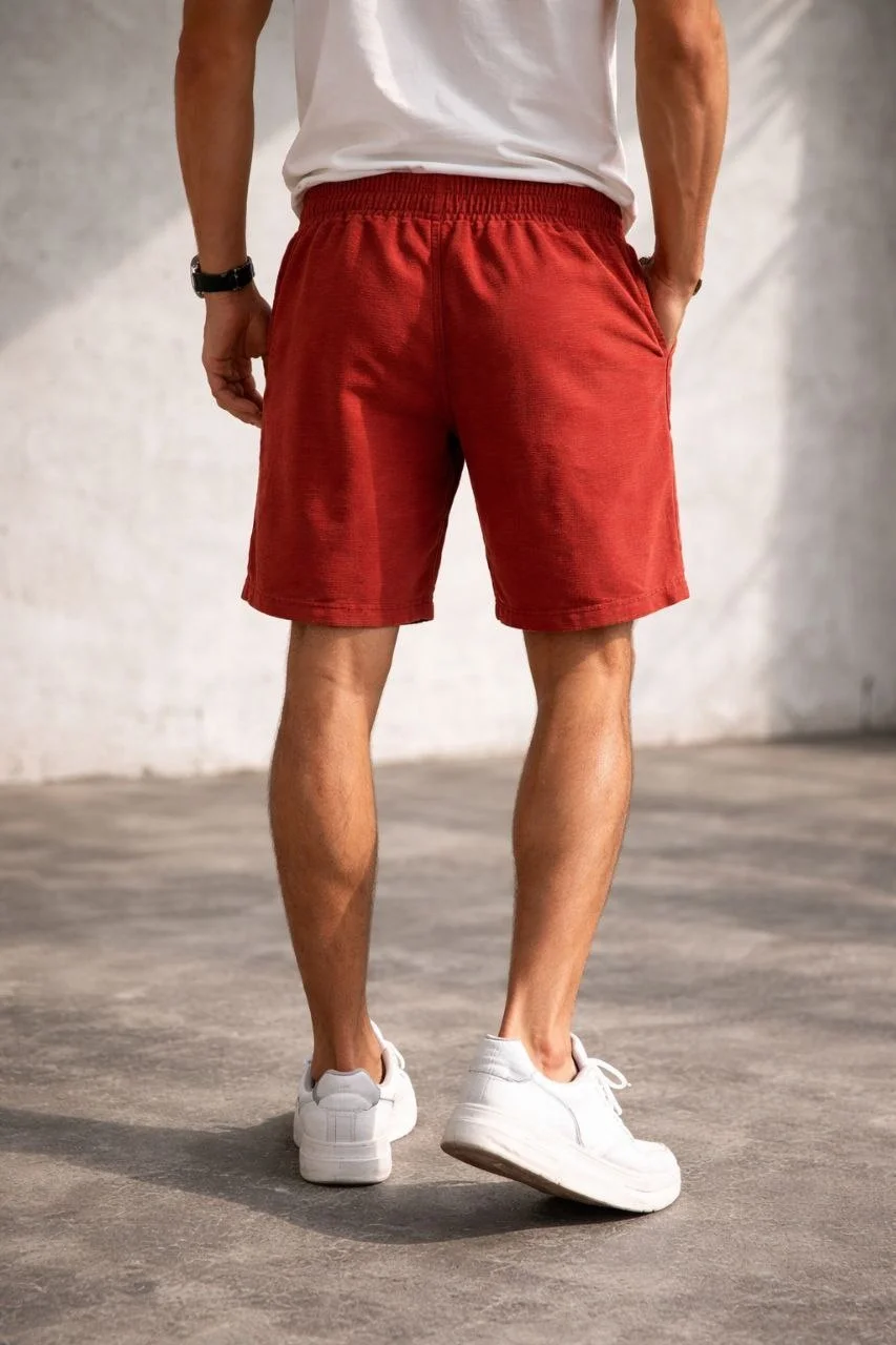 Erkek otoban Dokuma Şort Beli Lastikli Bağcıklı, Cepli, Rahat Kesim Günlük Yazlık Şort - Turuncu