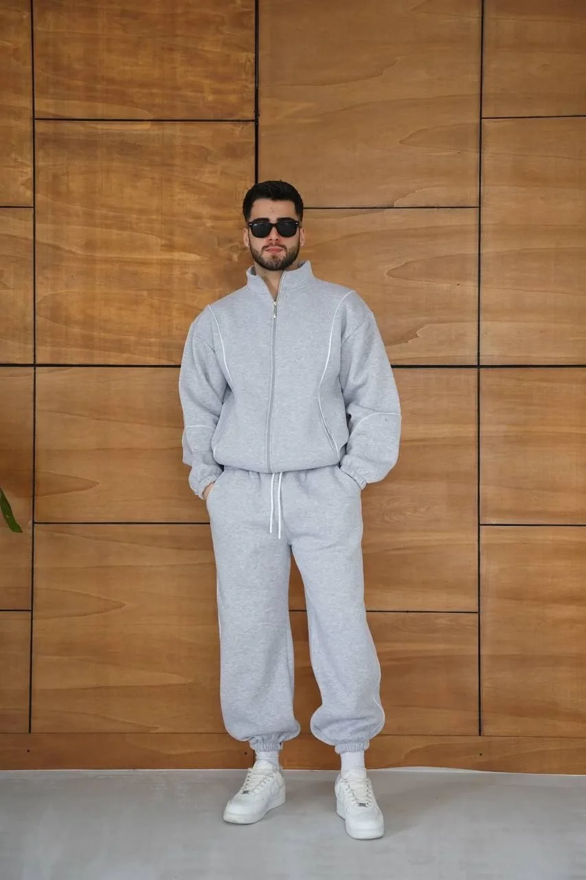 Erkek Premium Parçalı Eşofman Takım - Dik Yaka Fermuarlı Biyeli Sweatshirt Lastik - Gri
