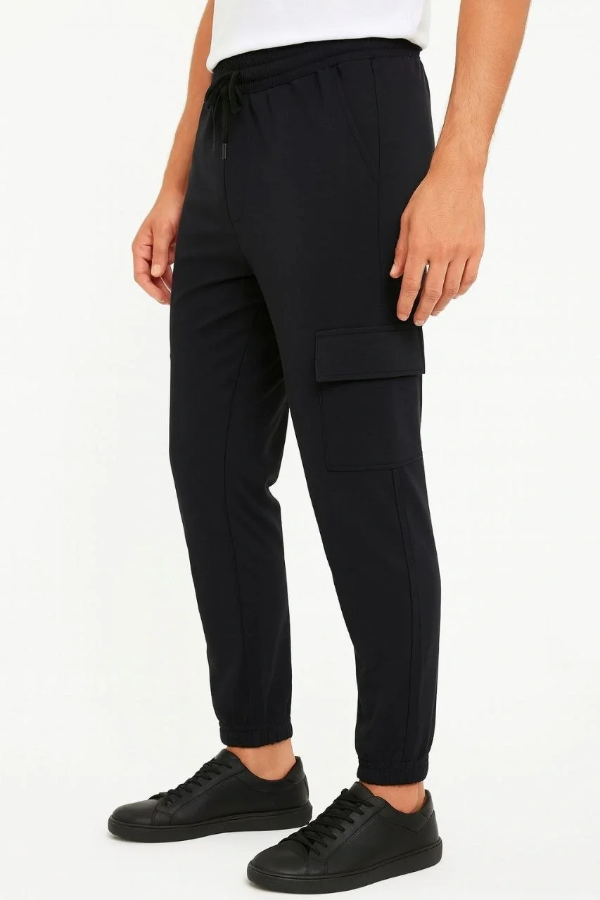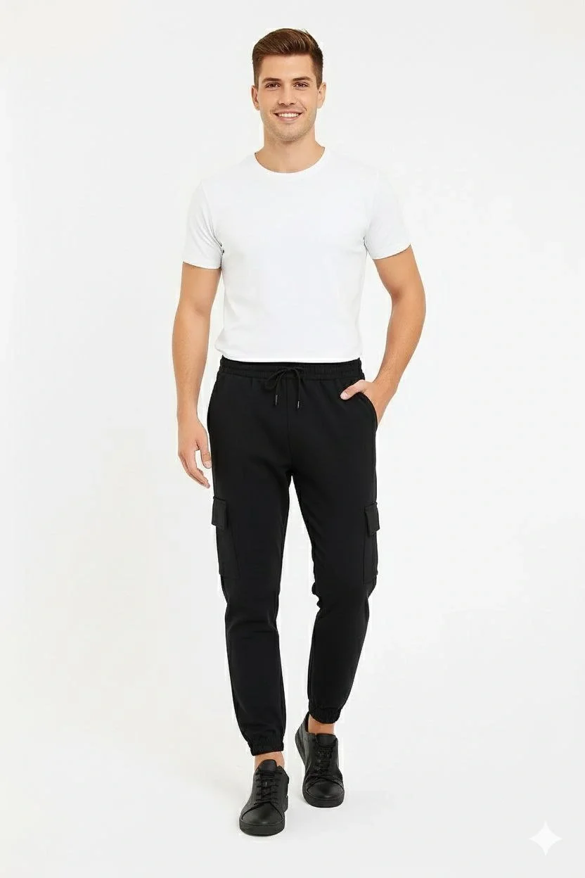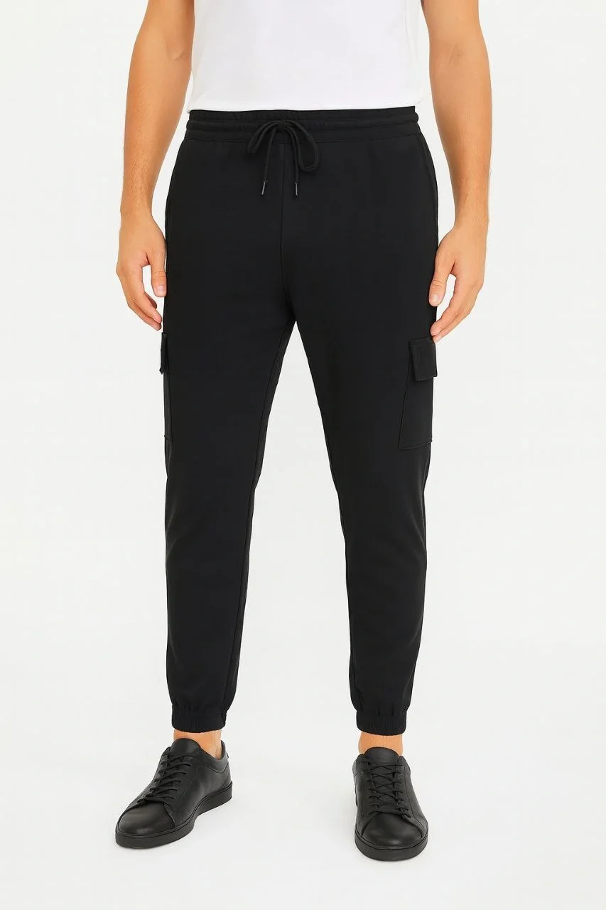 Erkek Siyah Jogger Eşofman Altı Kalıp Kargo Cepli Lastikli Paça Spor Pantolon - Siyah