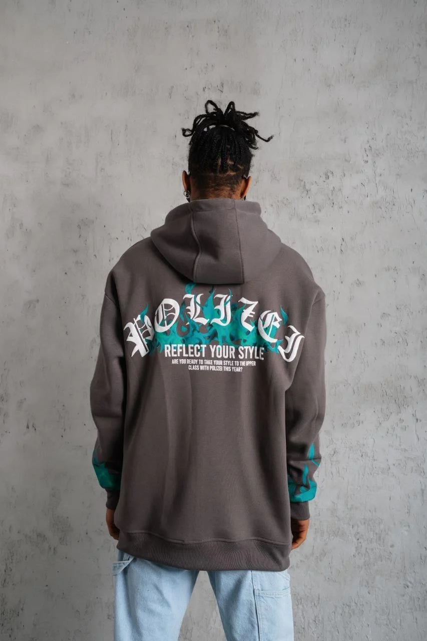 Erkek Üç İplik İçi Pamuklu Alev Baskılı Kapüşonlu Sweatshirt - Gri