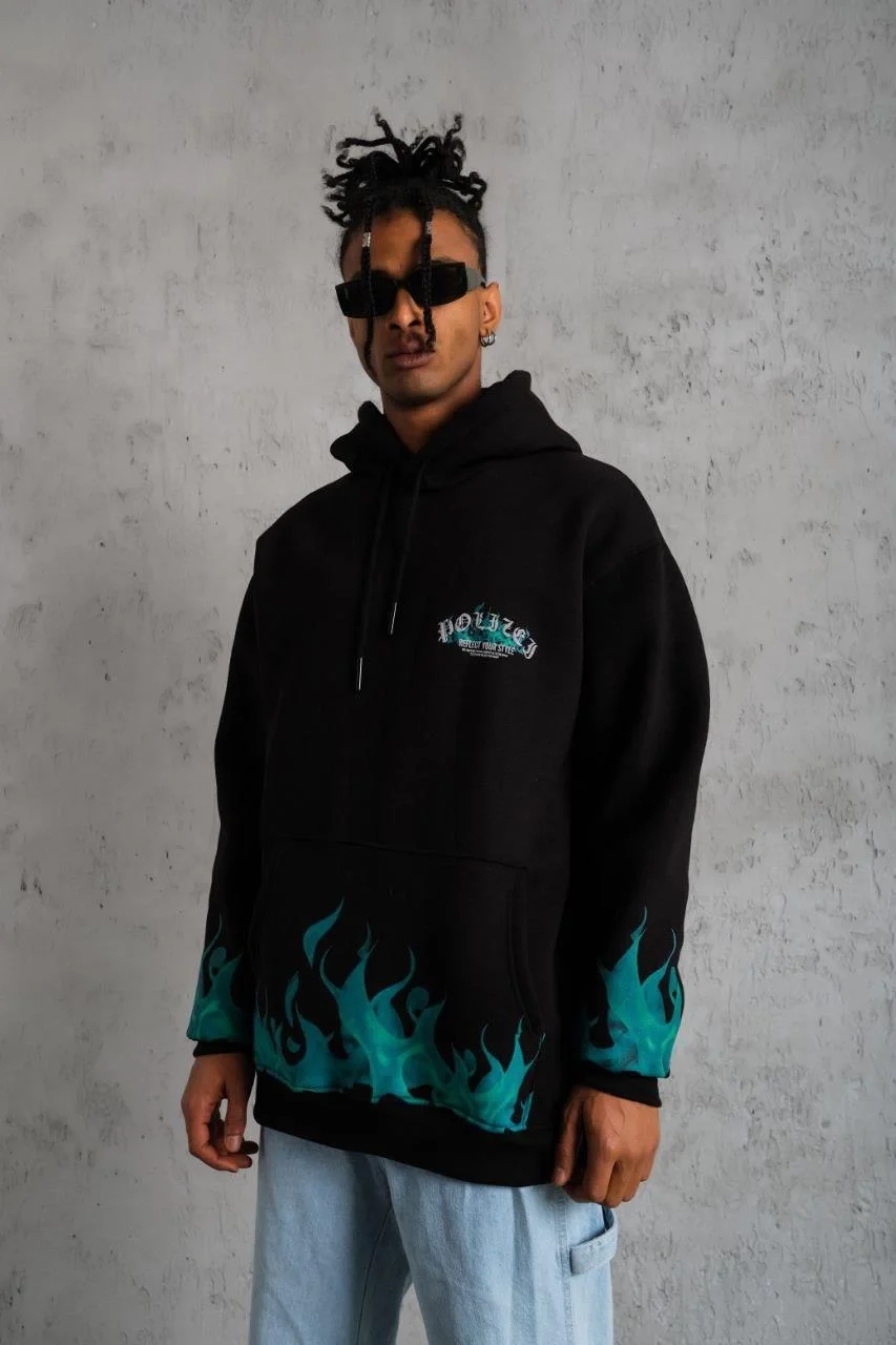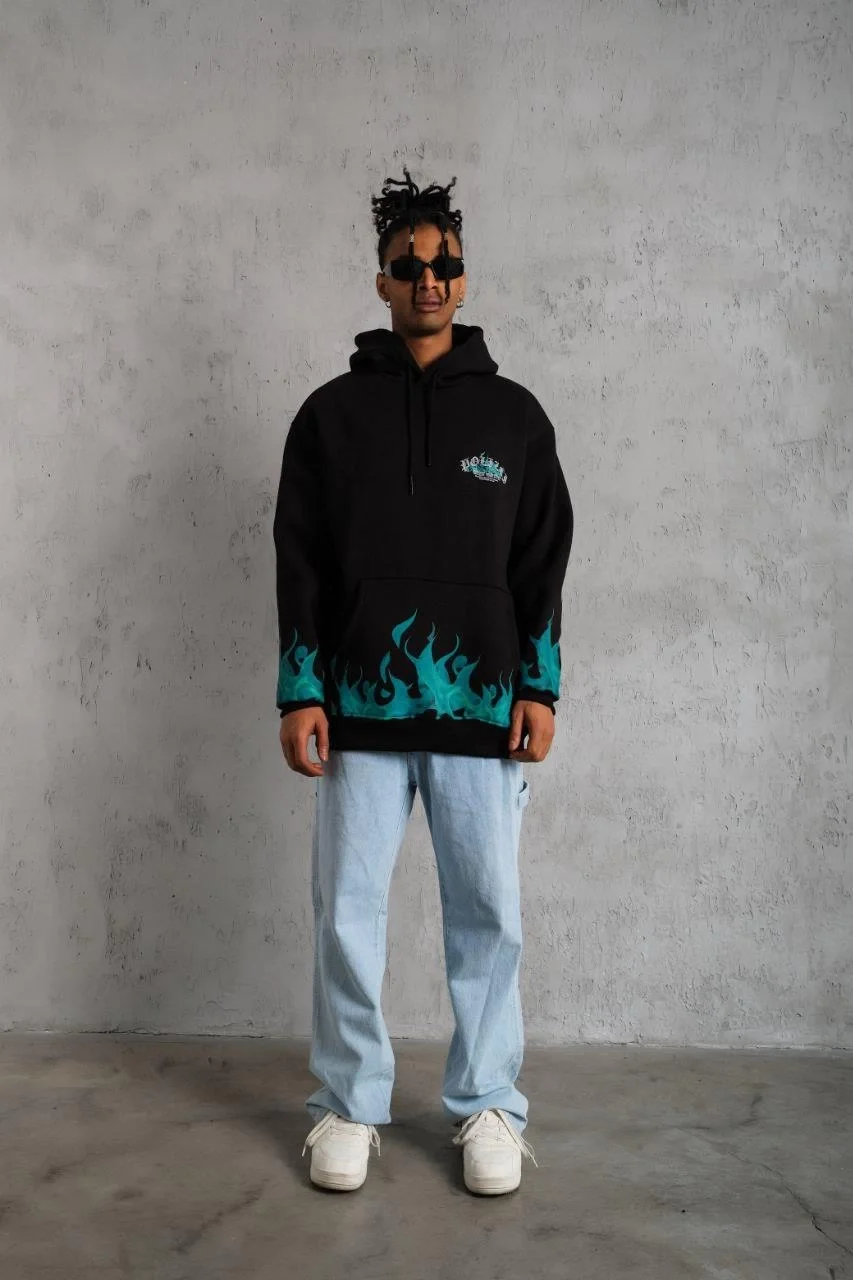 Erkek Üç İplik İçi Pamuklu Alev Baskılı Kapüşonlu Sweatshirt - Siyah