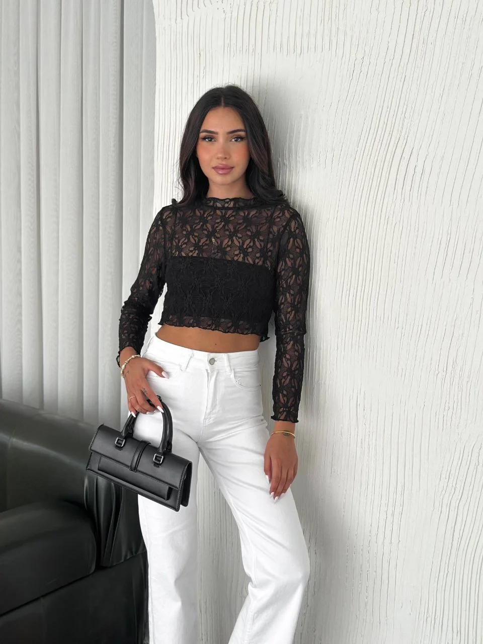 Kadın Dantel Uzun Kol Bluz- Siyah
