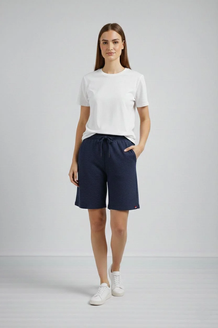 Kadın Dokuma otoban Şort Beli Lastikli Bağcıklı Cepli Kesim Şort - Lacivert