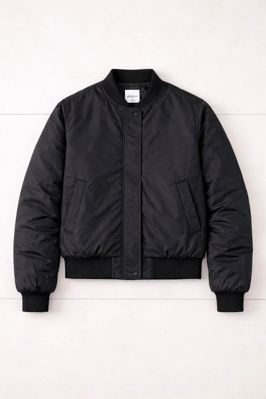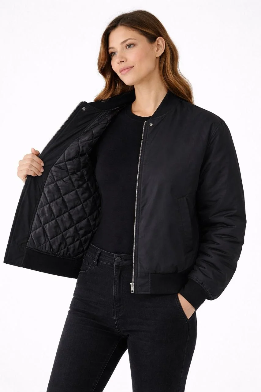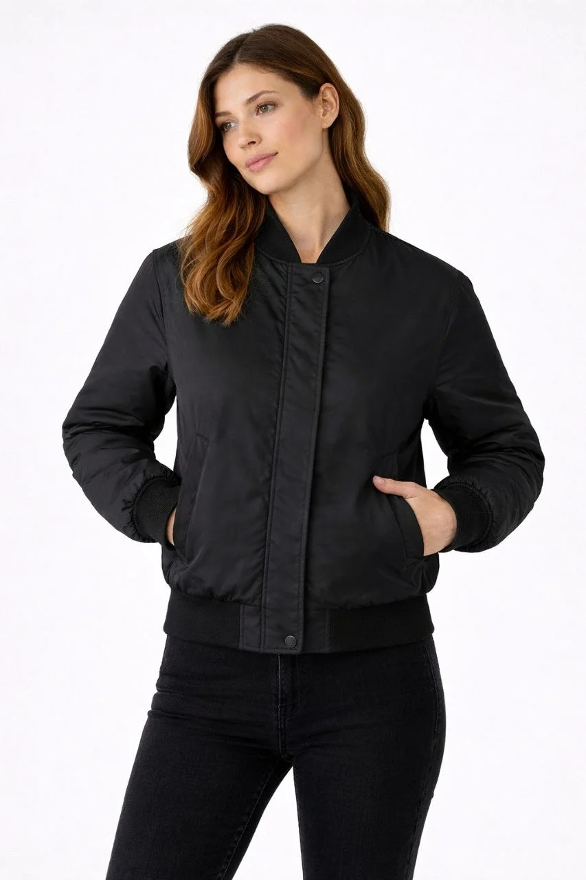 Kadın Premium Bomber Ceket Çıtçıt Kapamalı, Ribana Manşetli, Astarlı, Regular Fit Mont - Siyah