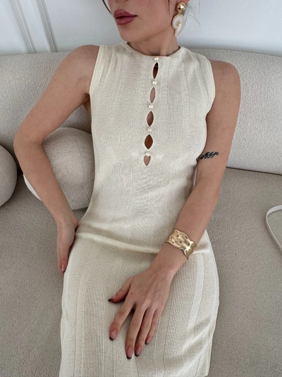 Kalın Fitilli Uzun Triko Elbise - Kırık Beyaz