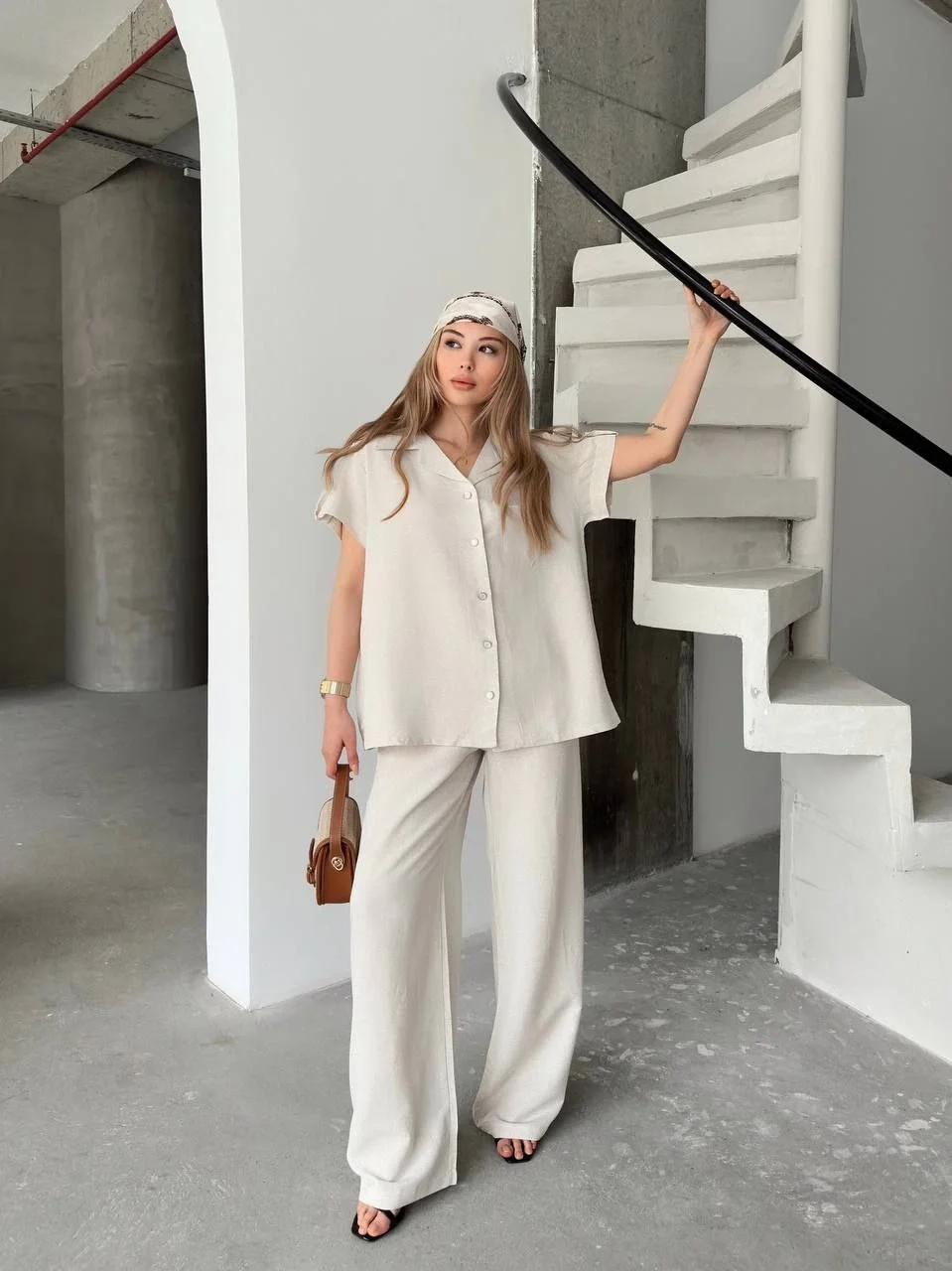 Keten Kısa Kollu Cepli Gömlek Pantolon ikili Takım - Beyaz