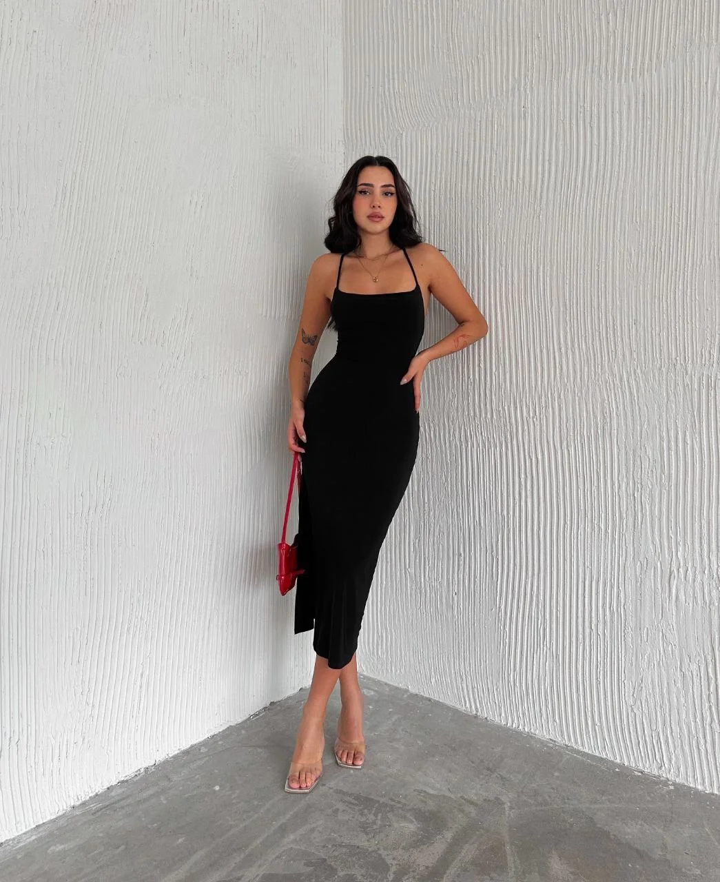 Sırt Bağlamalı Derin Yirtmaç Askılı Elbise - Siyah