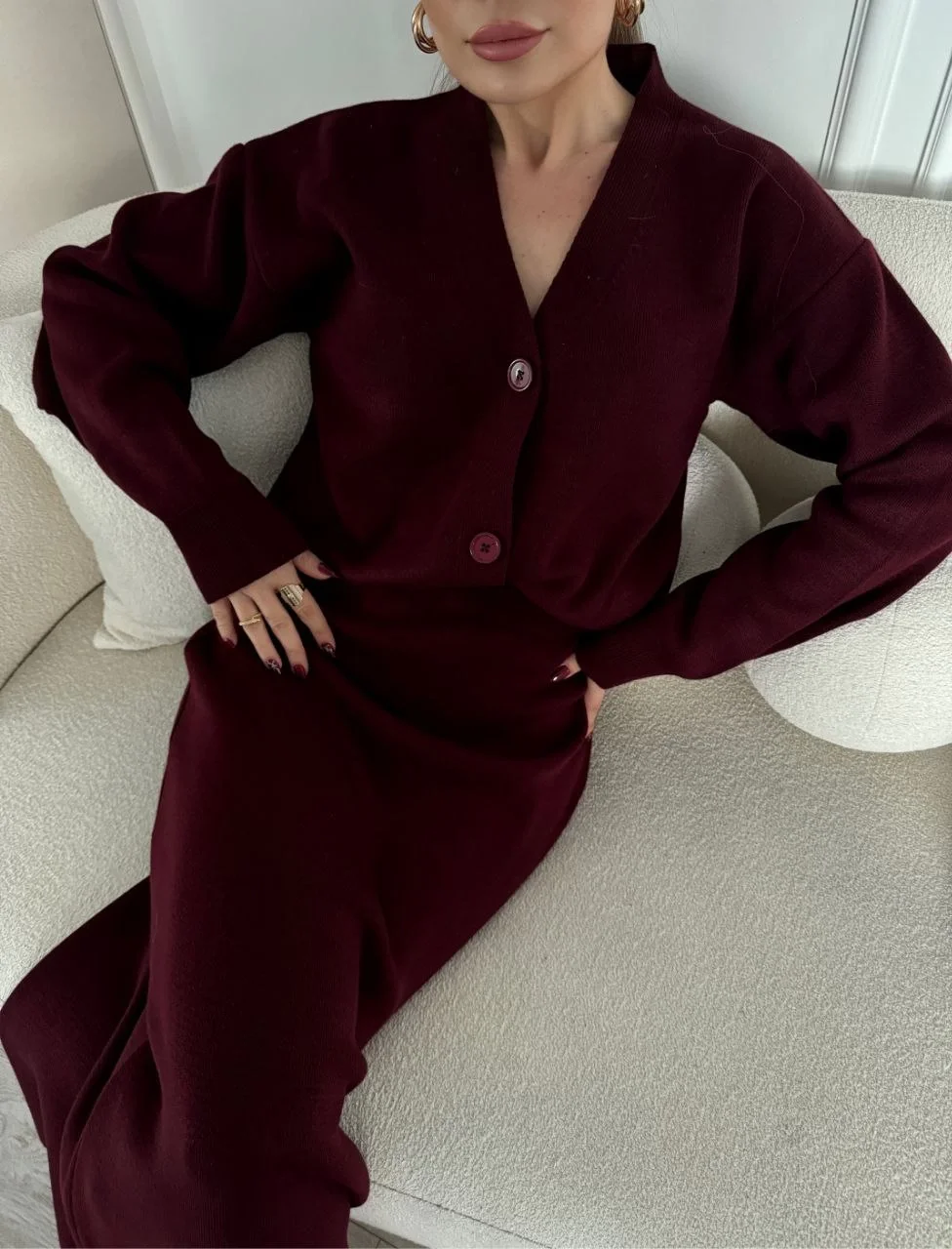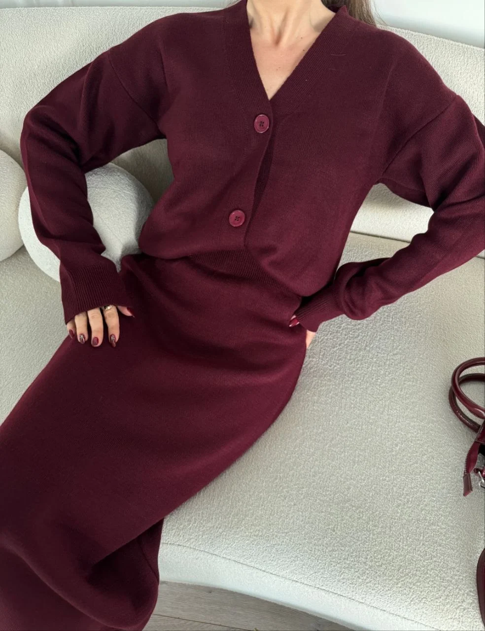 V Yaka 3 Düğmeli Hırka Takım Triko İkili Etekli - Bordo