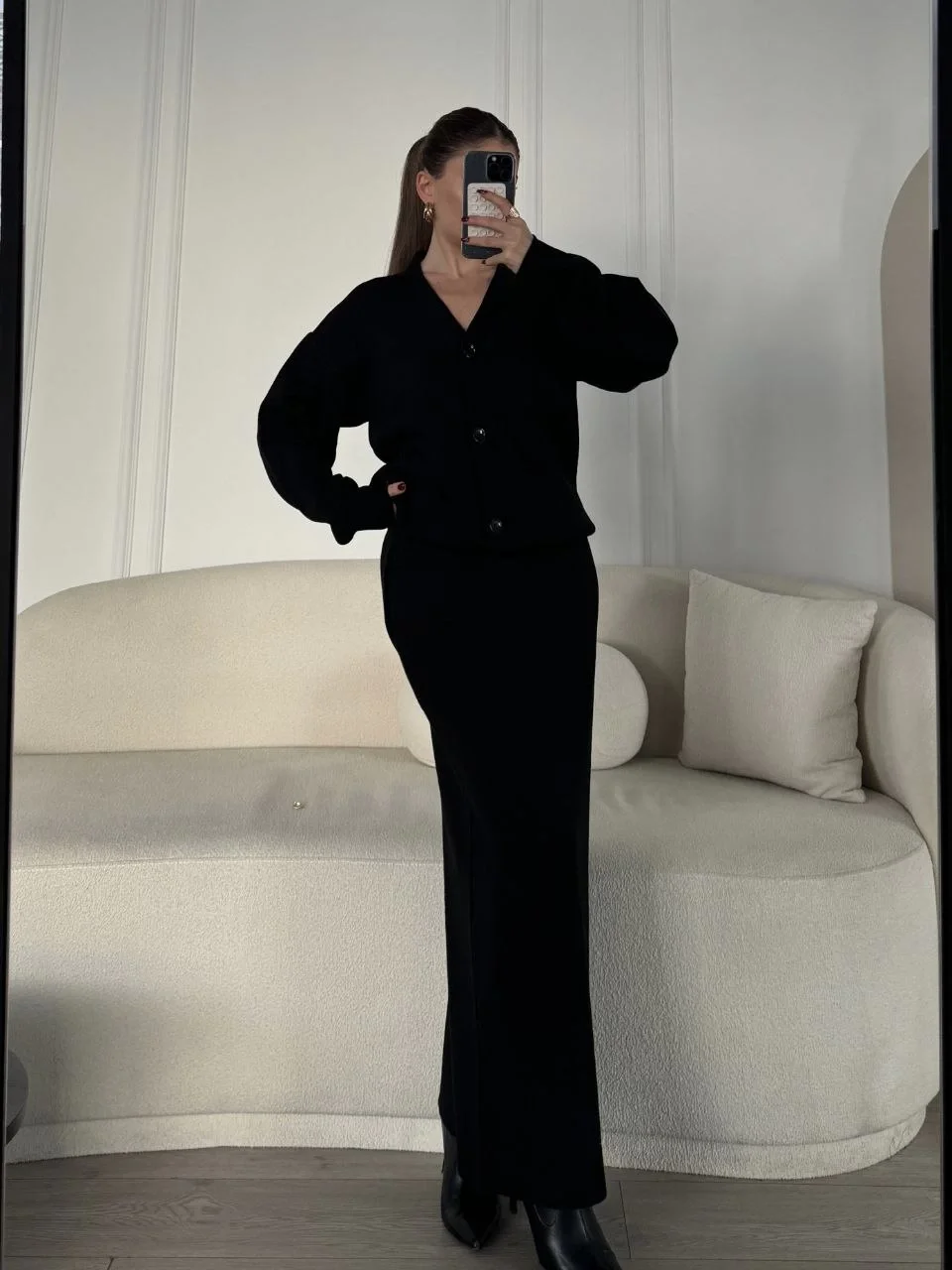 V Yaka 3 Düğmeli Hırka Takım Triko İkili Etekli - Siyah