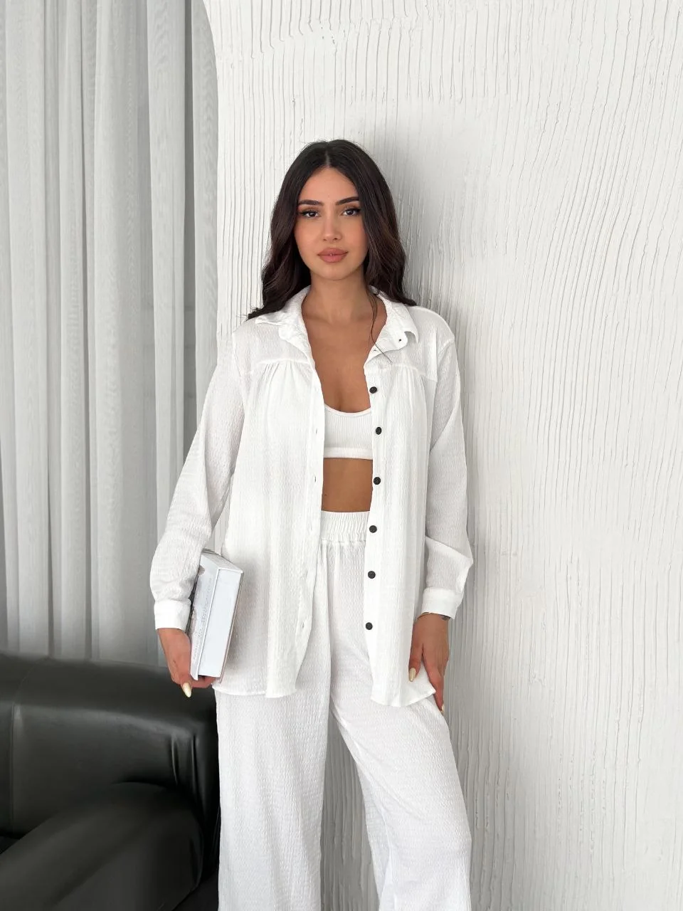 Yakalı Düğmeli Uzun Kollu Gömlek Pantolon ikili Takım - Beyaz